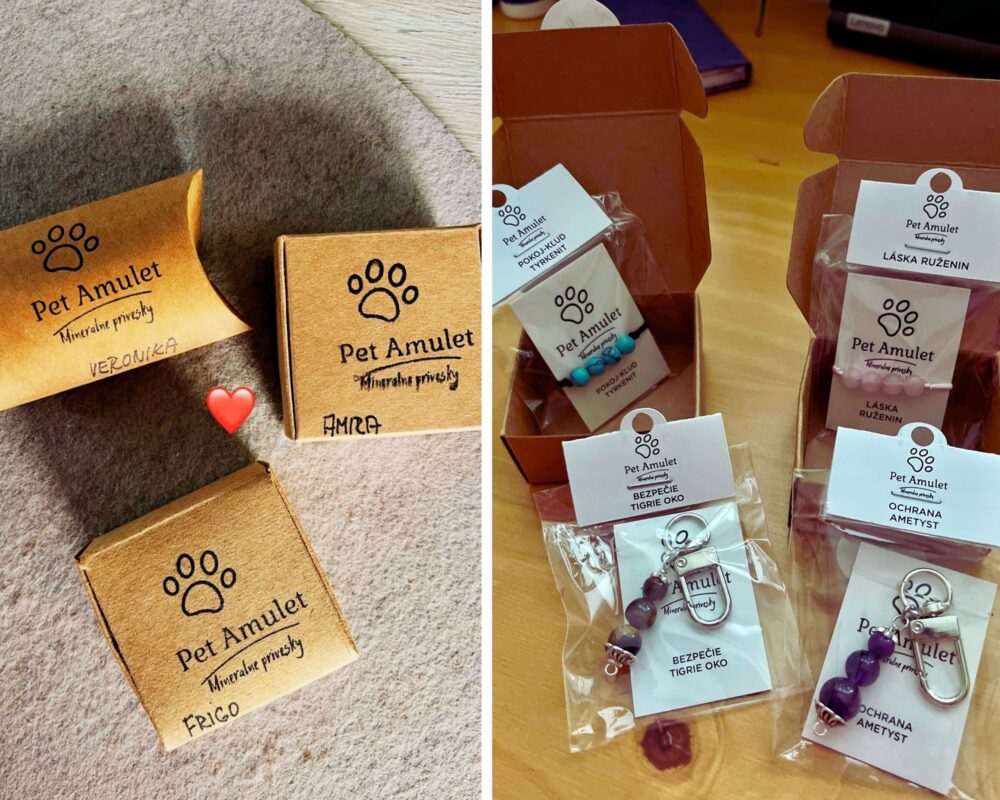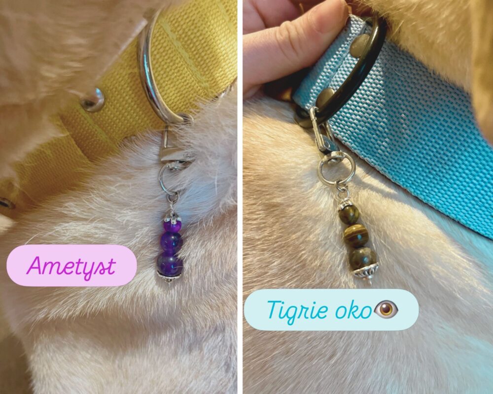 Minerálne prívesky sú v dvoch variantách-visiace a prevliekacie. My sme dostali na vyskúšanie oboje. Myslela som si, že tie prevliekacie budú skôr na obojok, ale prekvapivo dobre sa dali umiestniť aj na postroj a pekne držia. Aby ti nebolo ľúto, môžeš si objednať amulet aj pre seba. Dokonca si ho môžeš zladiť s amuletom pre tvoje zvieratko a mať tak symbol jedinečného puta medzi vami. Ja som ako prekvapenie dostala náramok nabitý láskou, ochranou a trpezlivosťou. Set pre pánička a psíka stojí 15 eur a samostatný náramok 8 eur.